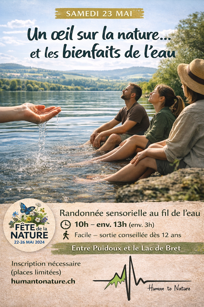 Une randonnée entre Puidoux et le Lac de Bret pour observer l’eau sous différentes facettes et expérimenter ses bienfaits. À travers des temps d’observation, de respiration et une immersion (bain de pieds ou totale selon les conditions), les participants découvrent les effets de l’eau sur l’énergie et le bien-être. Une expérience sensorielle et revitalisante.