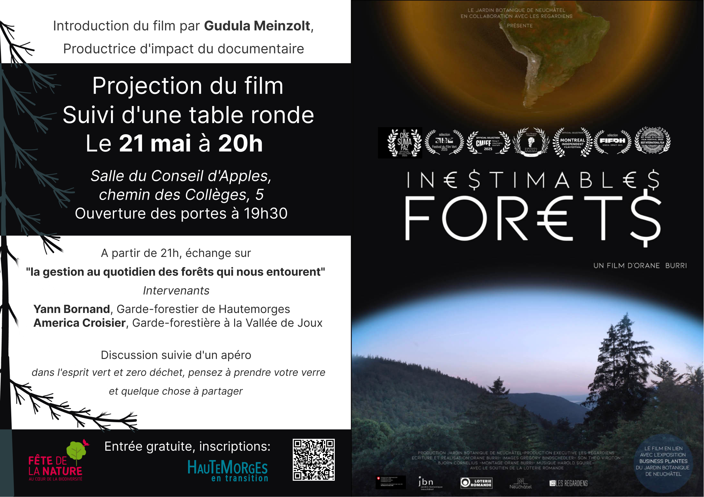 Projection du documentaire "Inestimables forêts", suivi d'un échange sur la gestion au quotidien des forêts qui nous entourent.